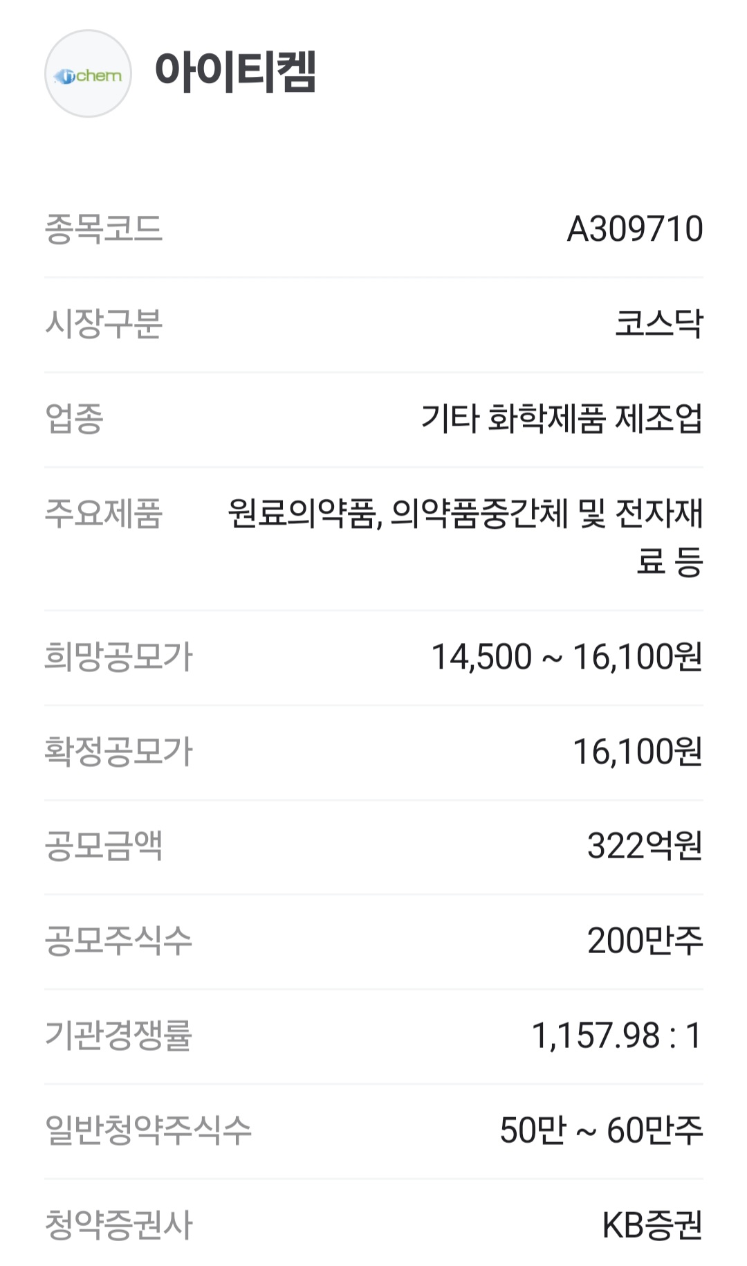 OLED 소재와 의약품 CDMO(위탁개발생산)를 주력으로 하는 아이티켐이 코스닥 상장을 앞두고 공모주 청약을 진행합니다.